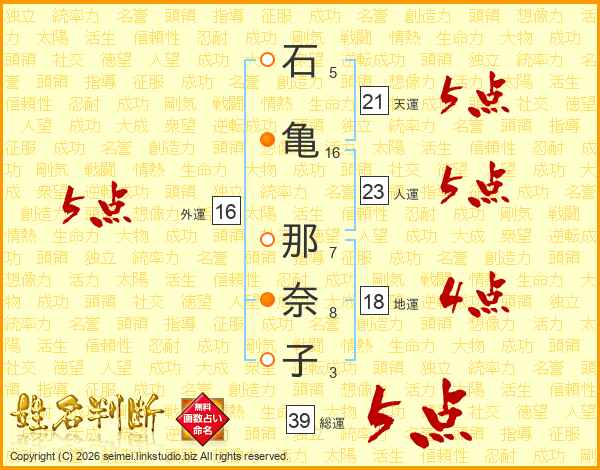 石(5画)亀(16画) 那(7画)奈(8画)子(3画)