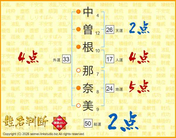 中(4画)曽(12画)根(10画) 那(7画)奈(8画)美(9画)