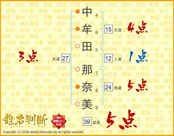 中(4画)牟(6画)田(5画) 那(7画)奈(8画)美(9画)