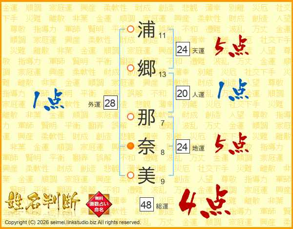浦(11画)郷(13画) 那(7画)奈(8画)美(9画)