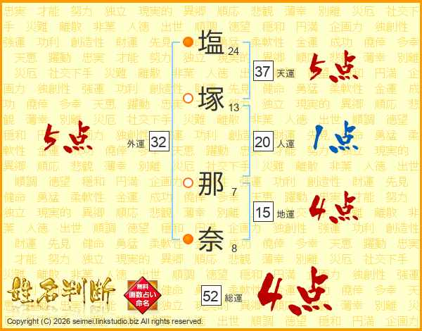 塩塚那奈さんの総運は52画の4点!