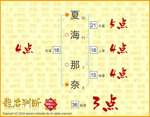 生活面を象徴する運勢です。外部から受ける影響力を表し、結婚運、家庭運や職場、環境への順応性を表します。総運から人運を引いた画数。姓や名が1文字の場合を除く。