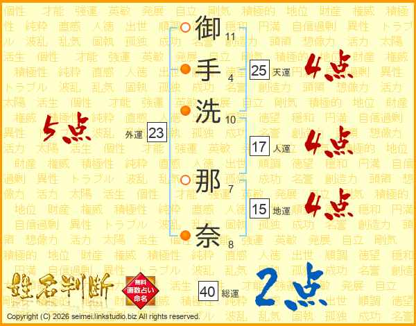 御(11画)手(4画)洗(10画) 那(7画)奈(8画)
