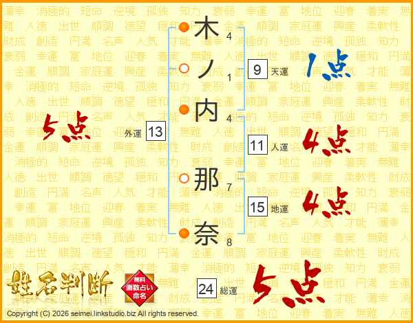木ノ内那奈さんの外運は13画の5点!