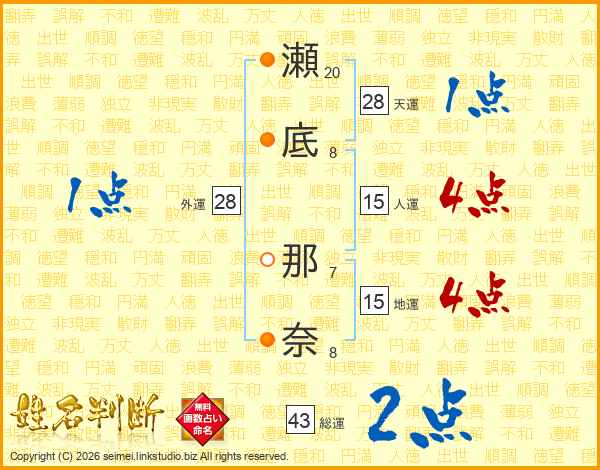 瀬底那奈さんの総運は43画の2点!