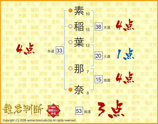 素(10画)稲(15画)葉(13画) 那(7画)奈(8画)