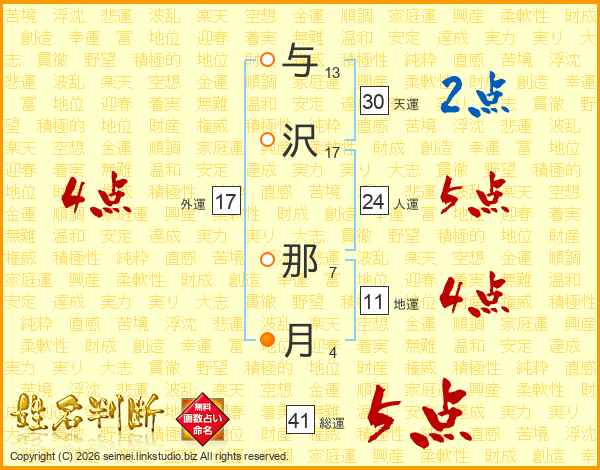 生活面を象徴する運勢です。外部から受ける影響力を表し、結婚運、家庭運や職場、環境への順応性を表します。総運から人運を引いた画数。姓や名が1文字の場合を除く。