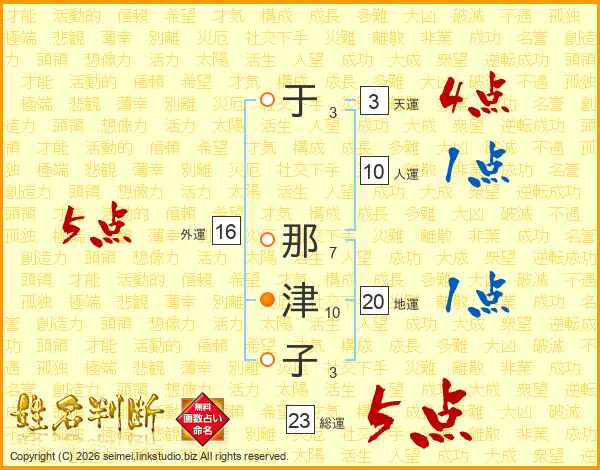 生活面を象徴する運勢です。外部から受ける影響力を表し、結婚運、家庭運や職場、環境への順応性を表します。総運から人運を引いた画数。姓や名が1文字の場合を除く。