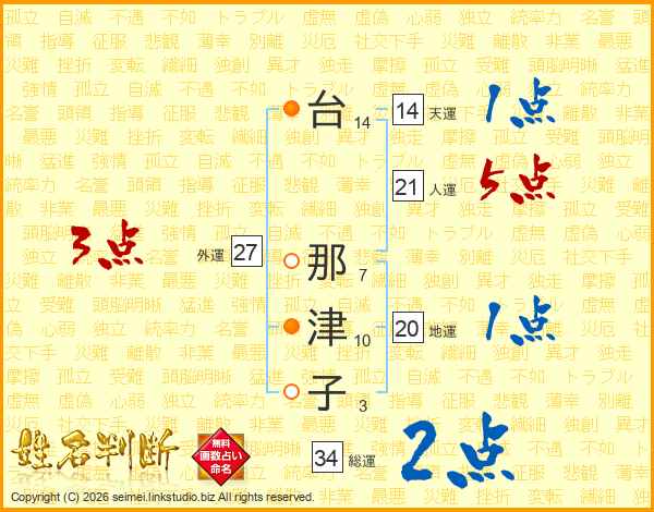 生活面を象徴する運勢です。外部から受ける影響力を表し、結婚運、家庭運や職場、環境への順応性を表します。総運から人運を引いた画数。姓や名が1文字の場合を除く。
