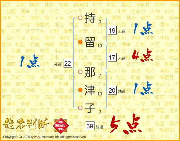 持(9画)留(10画) 那(7画)津(10画)子(3画)