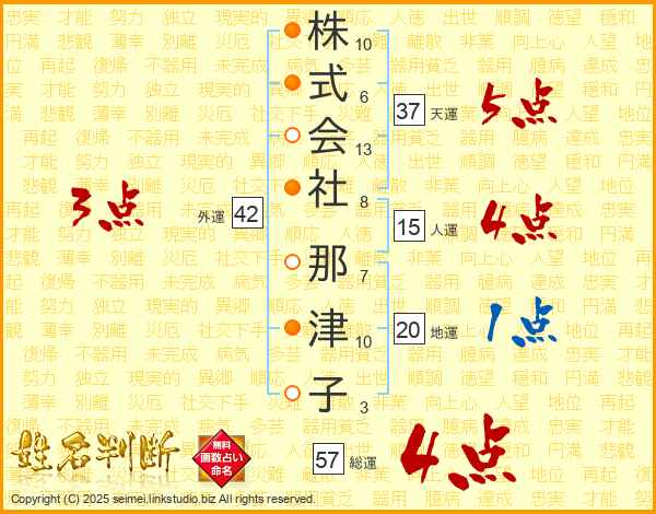 株(10画)式(6画)会(13画)社(8画) 那(7画)津(10画)子(3画)
