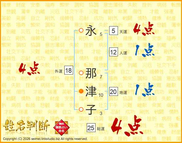 生活面を象徴する運勢です。外部から受ける影響力を表し、結婚運、家庭運や職場、環境への順応性を表します。総運から人運を引いた画数。姓や名が1文字の場合を除く。