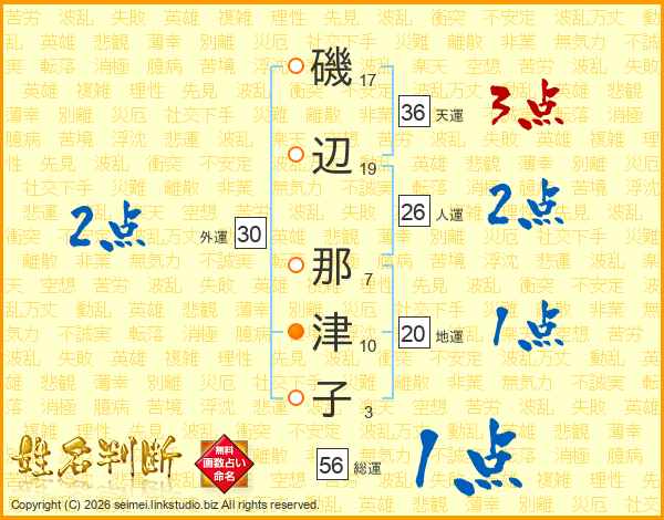 磯(17画)辺(19画) 那(7画)津(10画)子(3画)