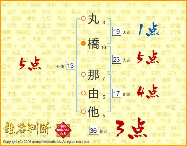丸(3画)橋(16画) 那(7画)由(5画)他(5画)