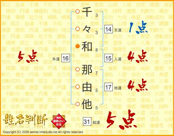 千(3画)々(3画)和(8画) 那(7画)由(5画)他(5画)