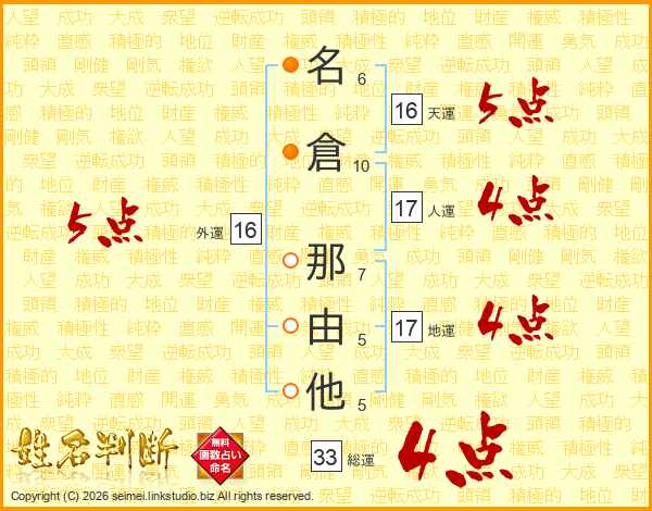 名(6画)倉(10画) 那(7画)由(5画)他(5画)