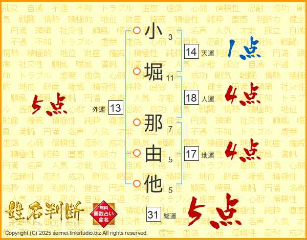 小堀那由他さんの総運は31画の5点!