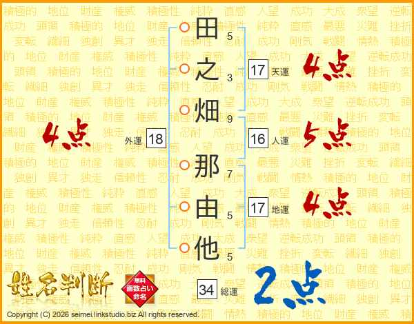 田(5画)之(3画)畑(9画) 那(7画)由(5画)他(5画)