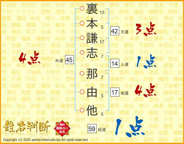 裏本謙志那由他さんの総運は59画の1点!