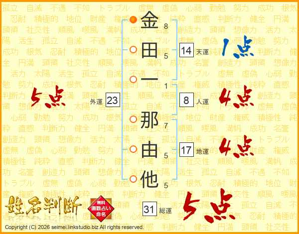金(8画)田(5画)一(1画) 那(7画)由(5画)他(5画)