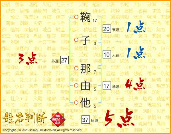 鞠(17画)子(3画) 那(7画)由(5画)他(5画)