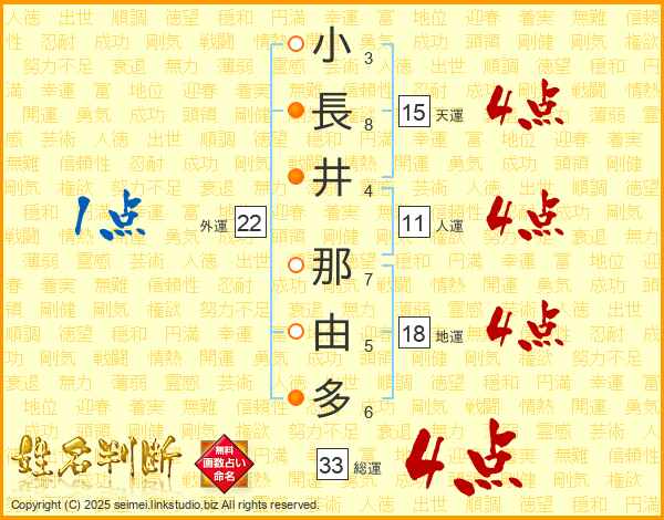 小(3画)長(8画)井(4画) 那(7画)由(5画)多(6画)