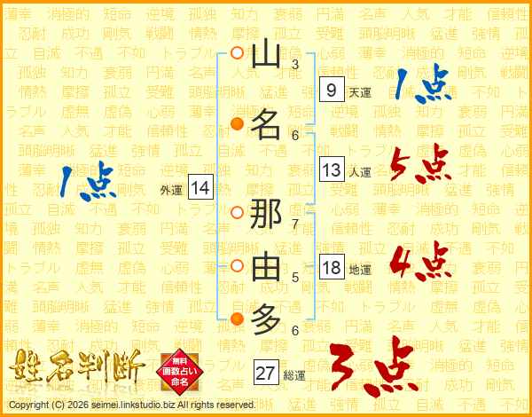 山(3画)名(6画) 那(7画)由(5画)多(6画)