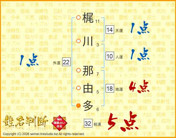 梶(11画)川(3画) 那(7画)由(5画)多(6画)