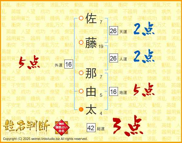 佐(7画)藤(19画) 那(7画)由(5画)太(4画)