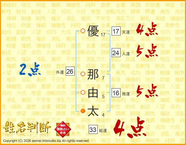 優那由太さんの総運は33画の4点!
