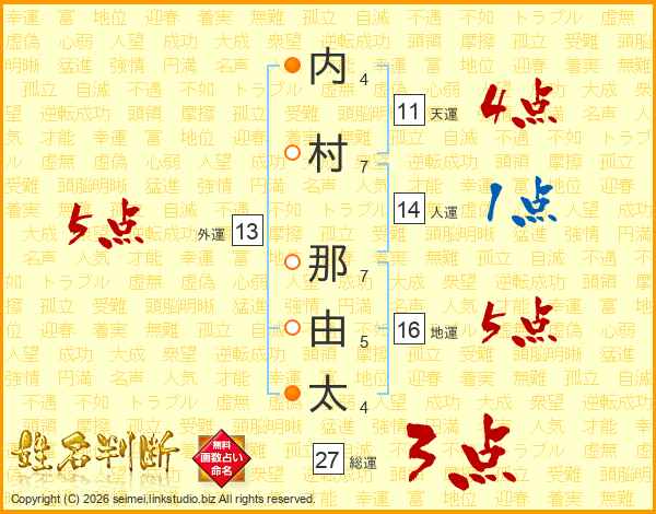 内(4画)村(7画) 那(7画)由(5画)太(4画)