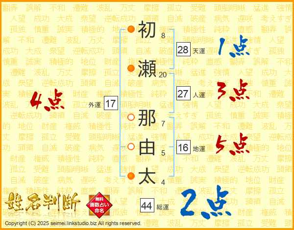 初(8画)瀬(20画) 那(7画)由(5画)太(4画)