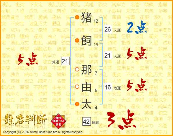 猪(12画)飼(14画) 那(7画)由(5画)太(4画)