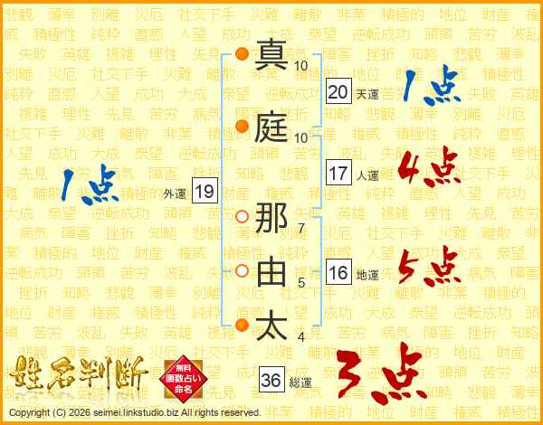 真(10画)庭(10画) 那(7画)由(5画)太(4画)