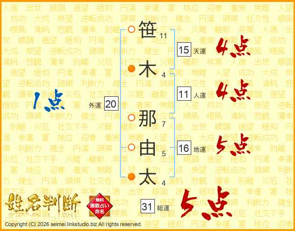 笹(11画)木(4画) 那(7画)由(5画)太(4画)