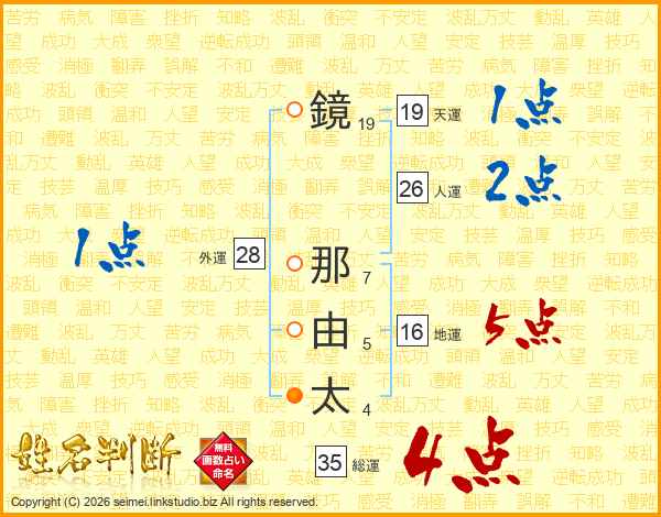 鏡(19画) 那(7画)由(5画)太(4画)