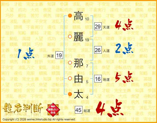 高(10画)麗(19画) 那(7画)由(5画)太(4画)