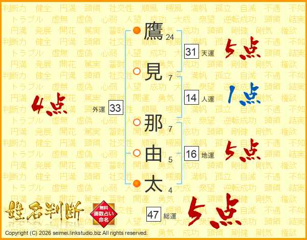 鷹見那由太さんの総運は47画の5点!