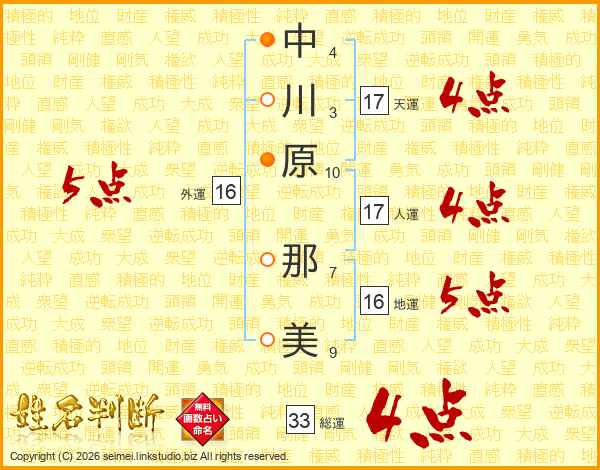 中(4画)川(3画)原(10画) 那(7画)美(9画)