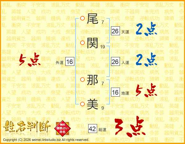 尾(7画)関(19画) 那(7画)美(9画)