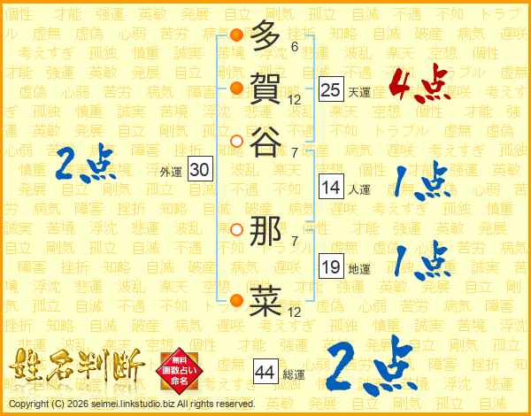 多(6画)賀(12画)谷(7画) 那(7画)菜(12画)