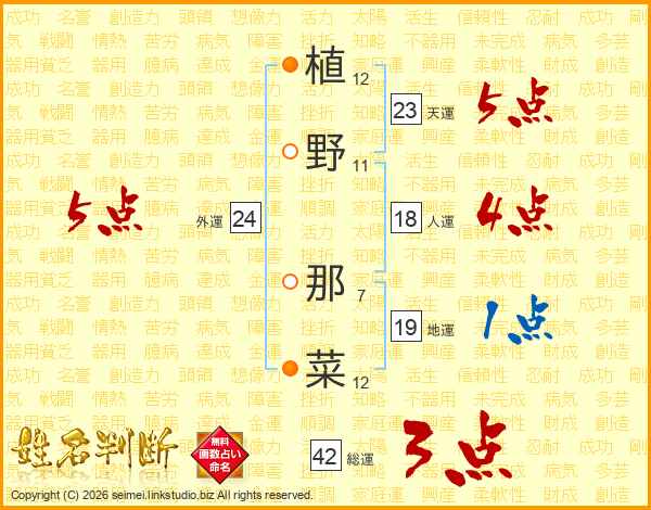 生活面を象徴する運勢です。外部から受ける影響力を表し、結婚運、家庭運や職場、環境への順応性を表します。総運から人運を引いた画数。姓や名が1文字の場合を除く。