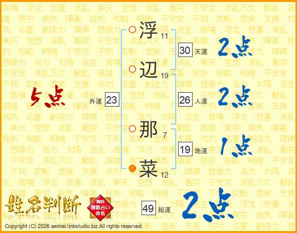 浮(11画)辺(19画) 那(7画)菜(12画)