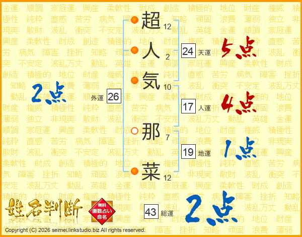 超(12画)人(2画)気(10画) 那(7画)菜(12画)