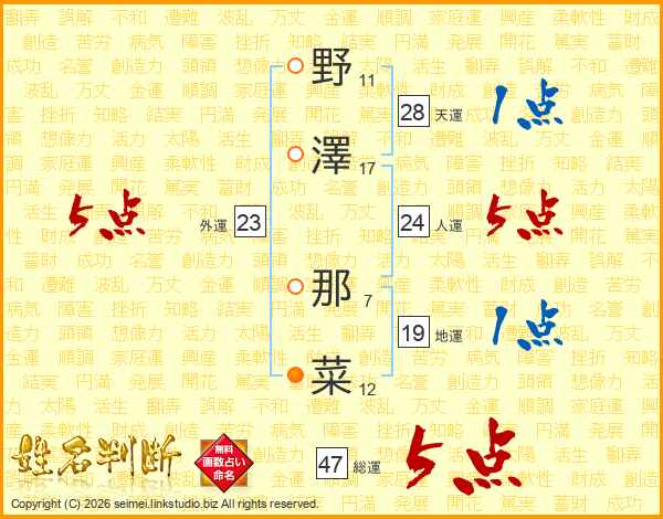 生活面を象徴する運勢です。外部から受ける影響力を表し、結婚運、家庭運や職場、環境への順応性を表します。総運から人運を引いた画数。姓や名が1文字の場合を除く。