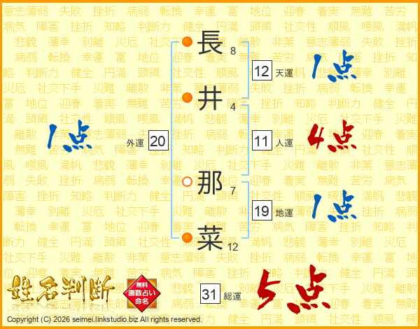 長(8画)井(4画) 那(7画)菜(12画)
