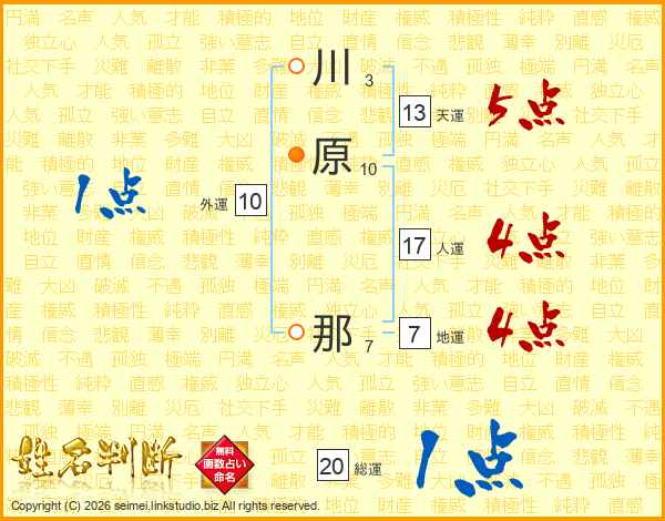 生活面を象徴する運勢です。外部から受ける影響力を表し、結婚運、家庭運や職場、環境への順応性を表します。総運から人運を引いた画数。姓や名が1文字の場合を除く。