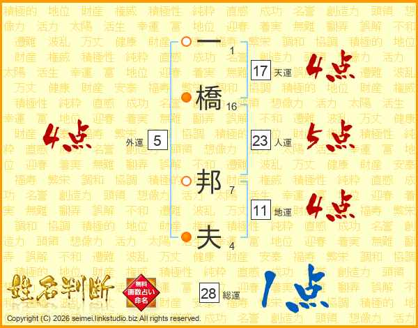 一(1画)橋(16画) 邦(7画)夫(4画)