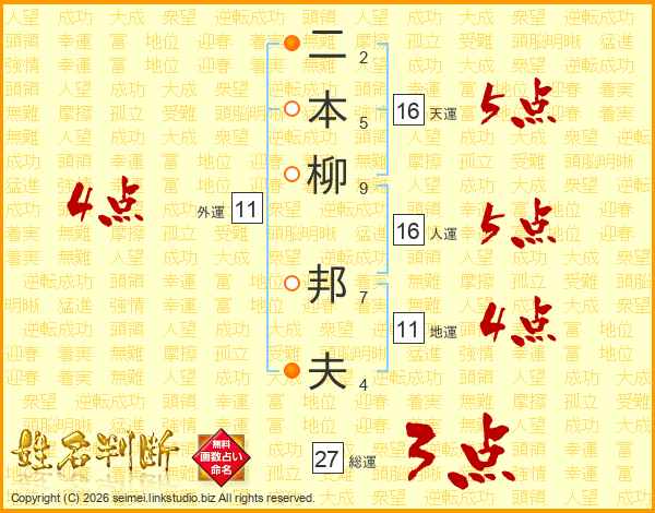二本柳邦夫さんの総運は27画の3点!