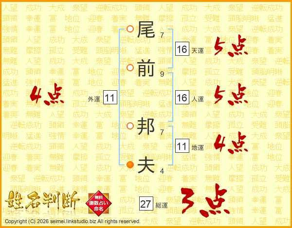 尾(7画)前(9画) 邦(7画)夫(4画)